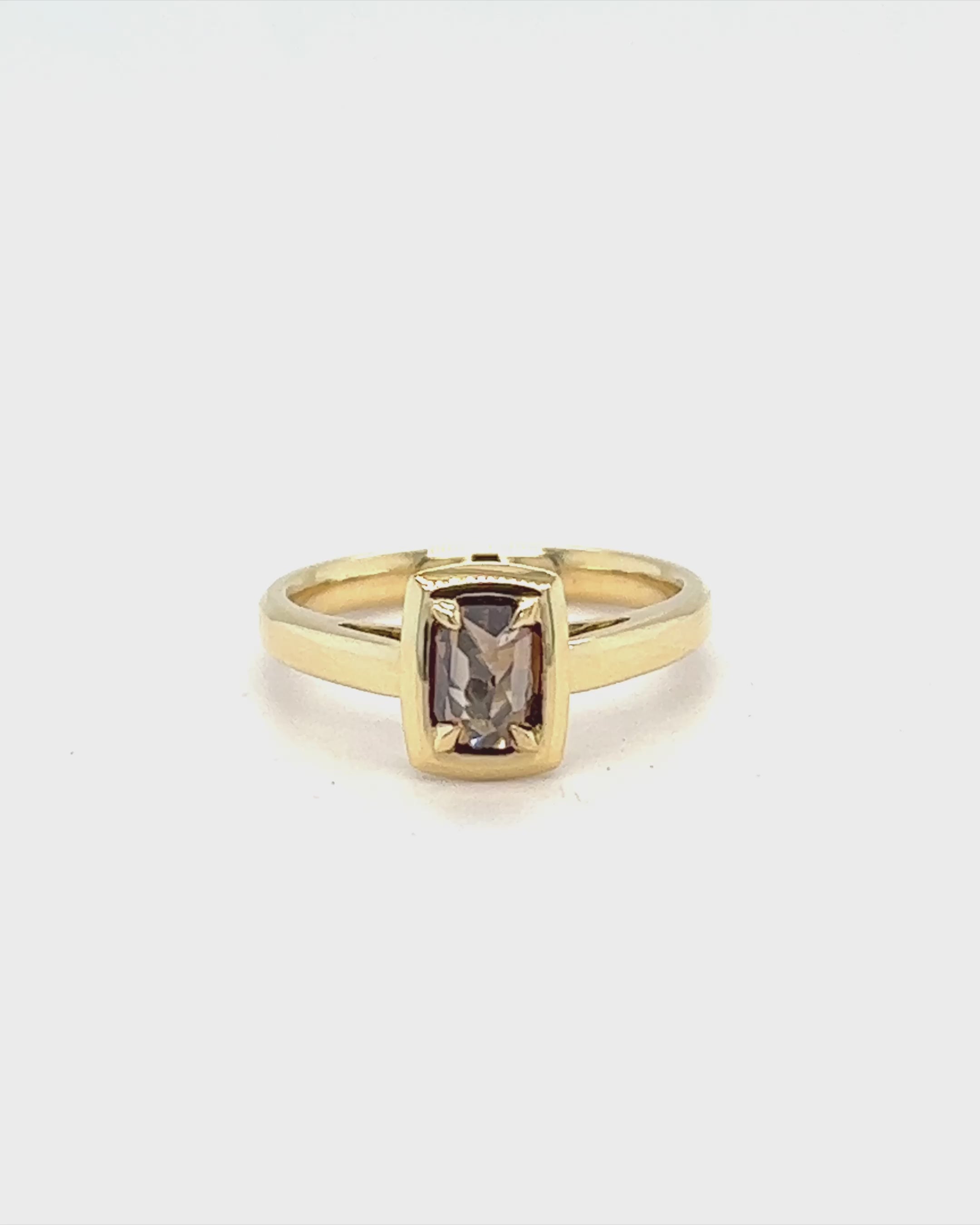The Aura ring is a classic beauty reimagined. A modern interpretation of the timeless solitaire, it is available in a number of styles. This piece features a cushion shape freeform rose cut diamond which emanates a scintillating display of light.