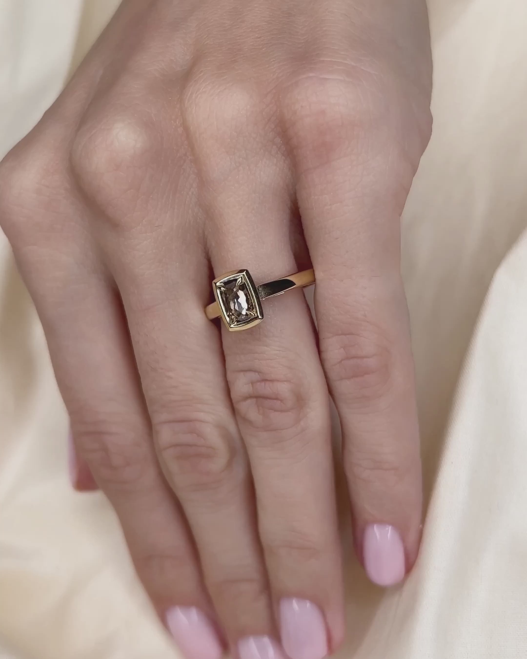 The Aura ring is a classic beauty reimagined. A modern interpretation of the timeless solitaire, it is available in a number of styles. This piece features a cushion shape but can be customised and made to order. Choose from a range of freeform rose cut diamonds and metals to create a ring that could only be yours.
